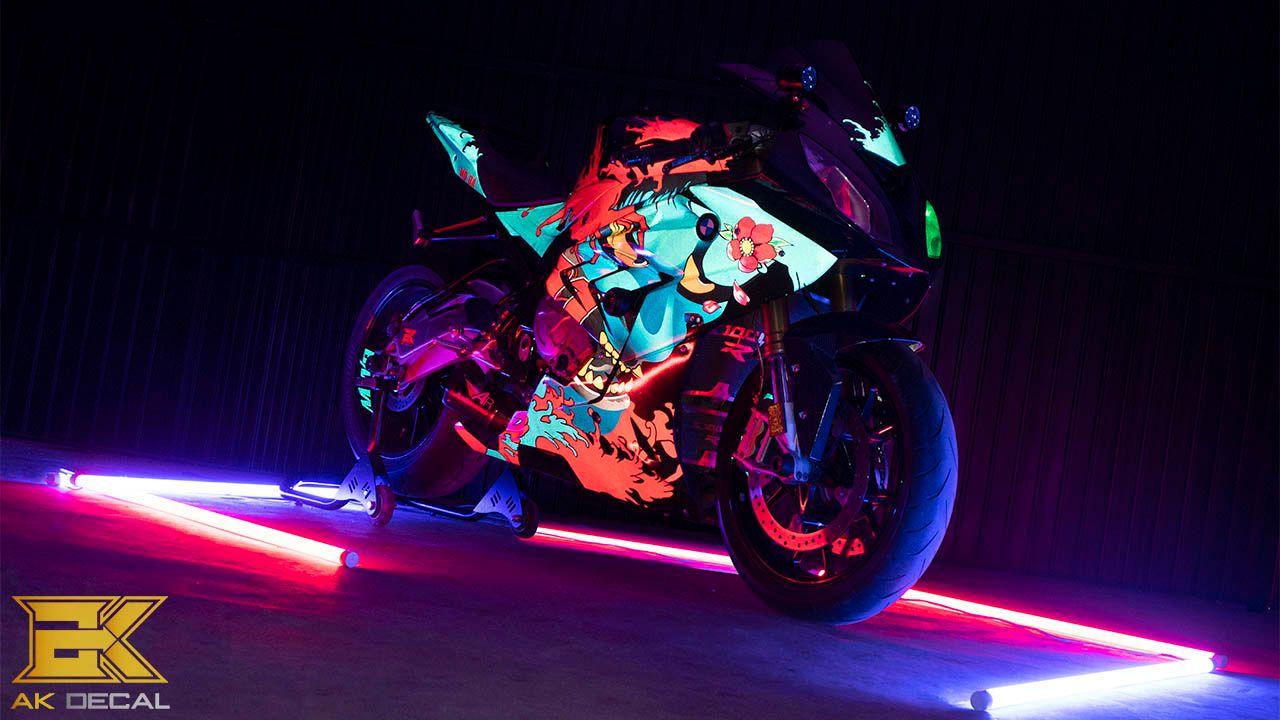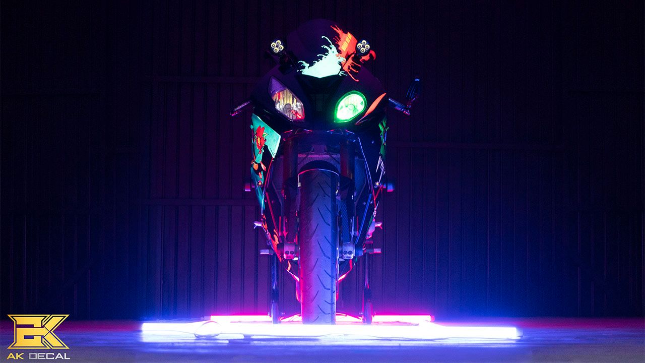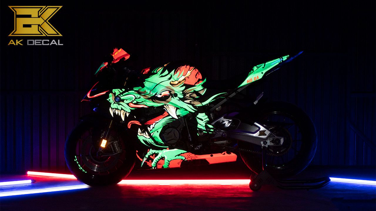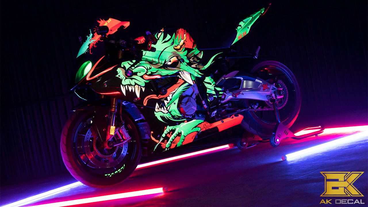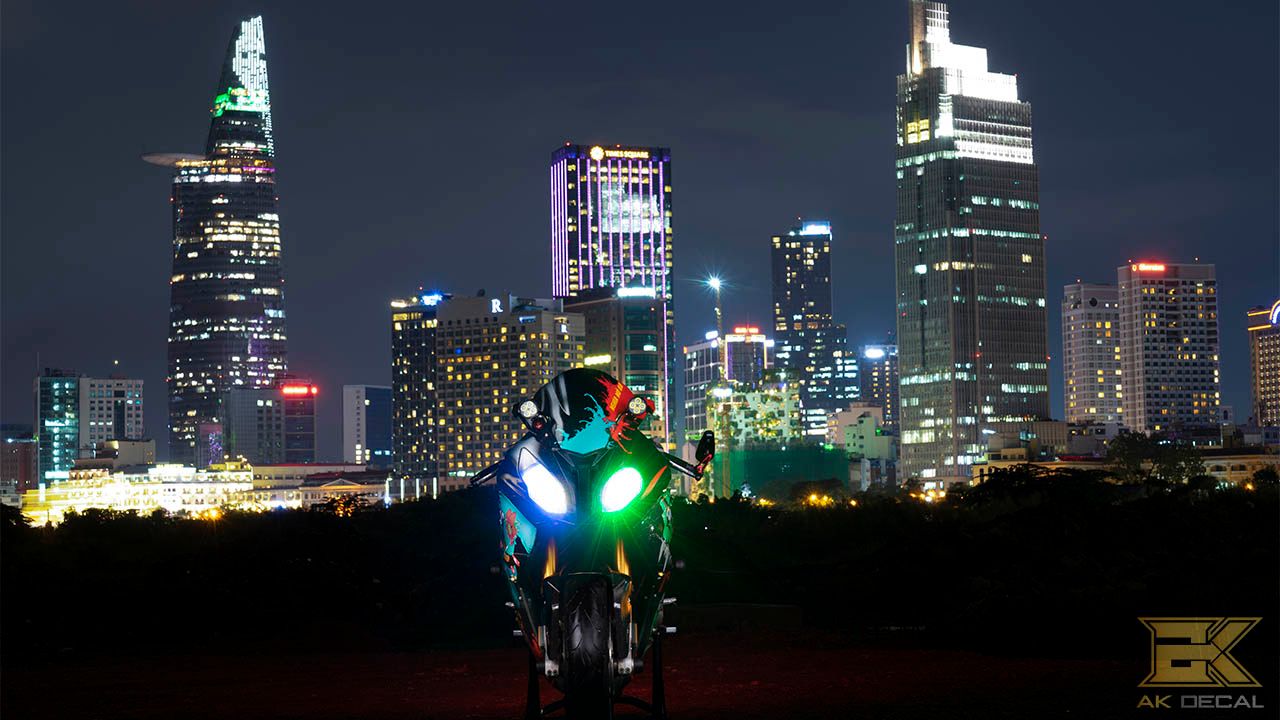 Tem xe BMW S1000rr Độ Decal Phản Quang nổi bật sáng trong đêm tối.