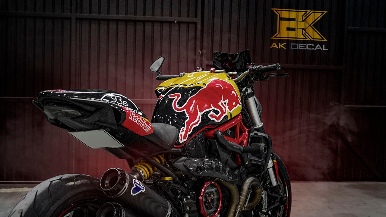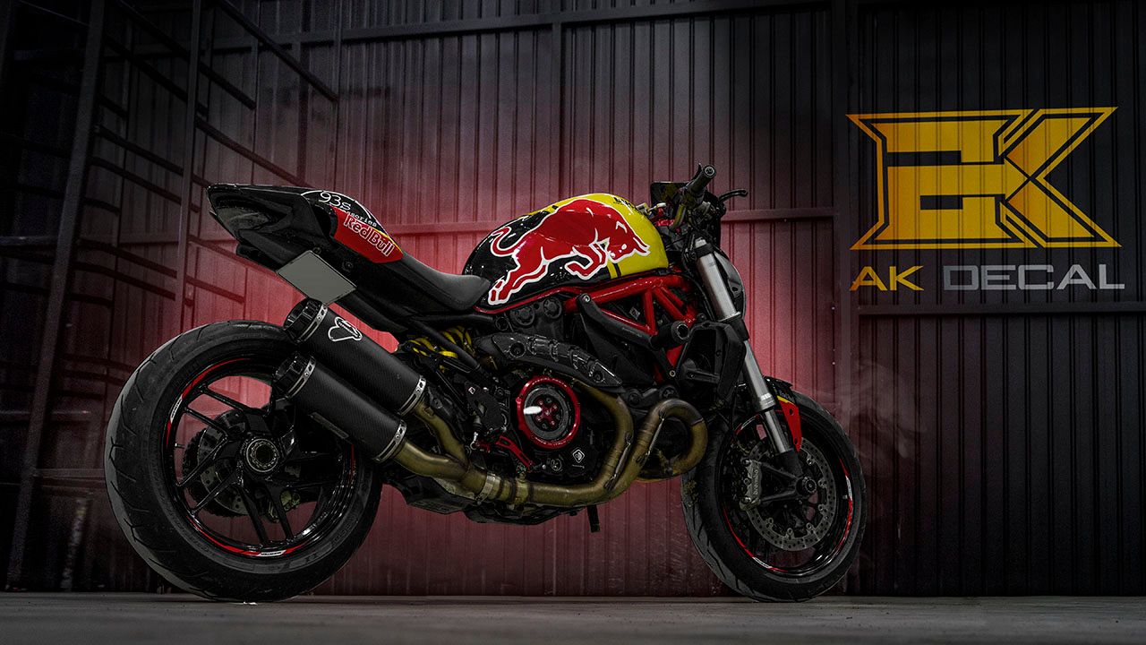 Quái vật Ducati Monster 821 khoác lên bộ cánh vô cùng mạnh mẽ cùng hình ảnh chú bò tót Red Bull càng làm cho bộ tem nổi bật hơn.